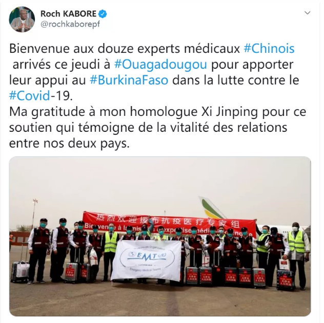除了埃塞俄比亚,中国政府还派出专家组来到了布基纳法索。布基纳法索总统卡博雷在社交媒体上发布消息,欢迎抗疫医疗专家组抵达。他说:“12名中国医疗专家抵达瓦加杜古,协助我国抗击COVID-19疫情。我向他们表示欢迎,感谢他们的热心帮助。”