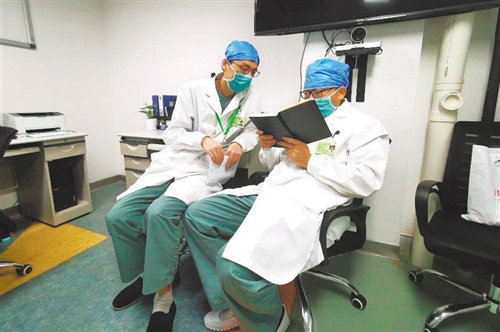 原庆(右)在医生办公室与同事交接班。余易安摄(中经视觉)