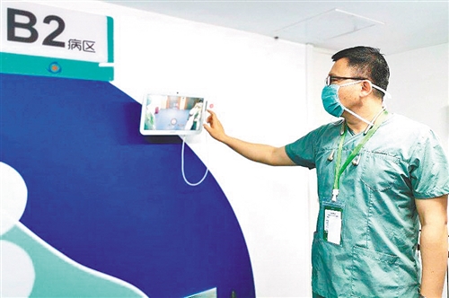 原庆通过可视系统与患者病房对话。余易安摄(中经视觉)