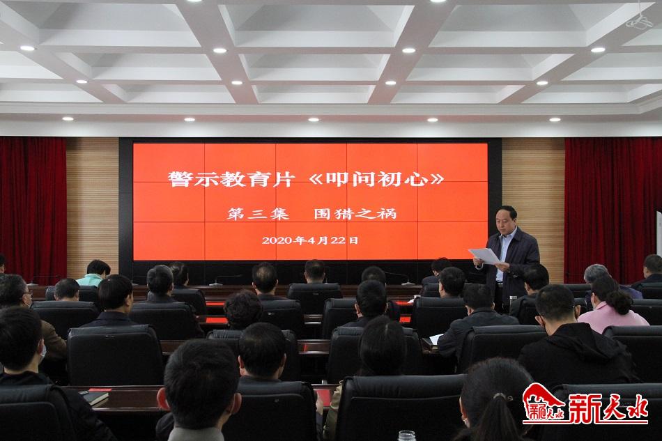 新天水讯【天水日报记者马放】4月22日,市人大常委会办公室组织机关党员和干部职工集中观看警示教育片《叩问初心》第三集“围猎之祸”。市人大常委会主任蒋晓强,副主任安志宏、宋建平、王晓琴,秘书长杨坤参加观看。