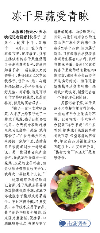“孩子一直不喜欢吃蔬菜,后来朋友给孩子送了一袋冻干果蔬,孩子还挺喜欢吃的。今天我专程到超市里来买几袋冻干果蔬,就当零食了。”在位于秦州区大众路的一家超市里,选购商品的消费者刘女士对记者说。另一位消费者张先生表示,虽然冻干果蔬与一些蔬菜、水果相比价格高,但为让孩子营养吸收更全面,我每次一买就是十几包。”