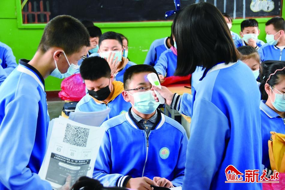天水市三中的学生也按照同样的程序进校入学。在校门口经过首次红外线体温检测后,学生进入教室在班主任监督下进行第二次互测体温。上课按照错层教学、分班自习、固定座位、错时活动、错时上放学。