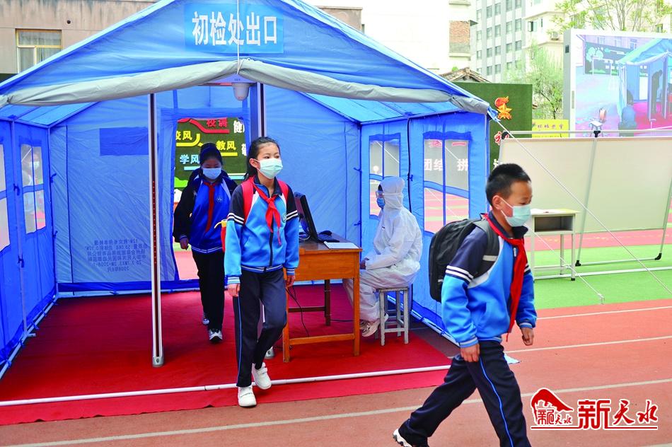 记者4月20日分别来到天水市建二小学、天水市三中,了解中小学生入学开课情况。当天早晨6点30分,建二小学全体教职工到岗,校外安排数十名老师在学校东西两侧数百米分散值守,要求学生按规定路线、安全间距进校。