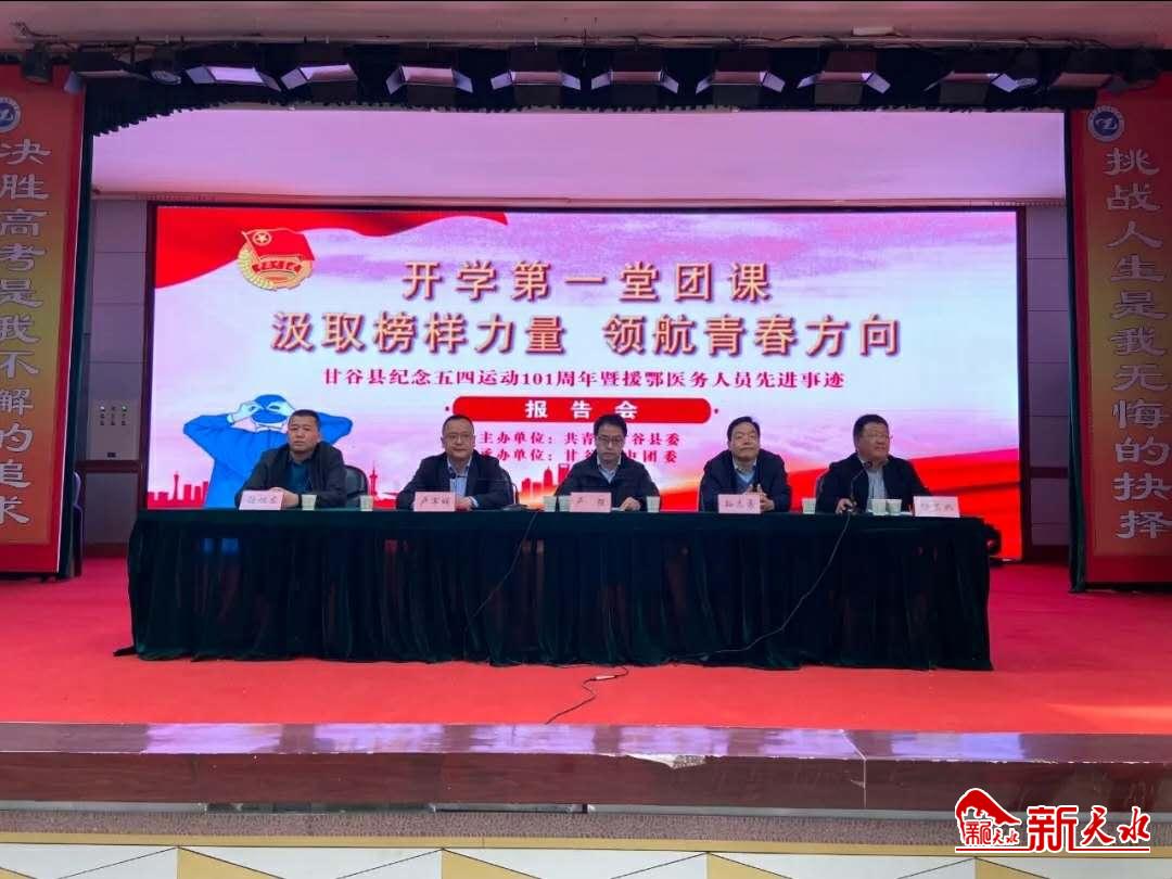 新天水讯【天水日报特约王建军 特约通讯员董晓峰】为了学习抗疫英雄不惧艰险、大爱无疆的崇高精神,积极营造勇于奉献、敢于担当的良好氛围,引领全县广大团员青年厚植爱国主义情怀、彰显拼搏奋斗精神,4月26日,由甘谷县教育局、共青团甘谷县委联合主办的甘谷县纪念五四运动101周年暨支援湖北鄂医务人员先进事迹报告会在甘谷一中多功能厅举行。