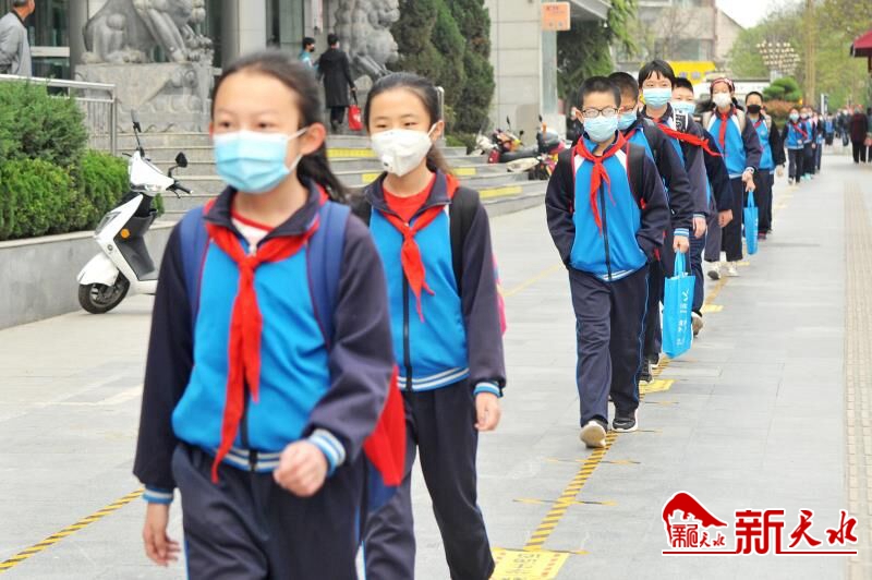 4月27日,天水市实验小学、建二小学的学生们按照间隔距离排队入学。当天,天水市小学1至4年级开学。至此,全市中小学全部开学。新天水·天水日报记者 孙镇 摄