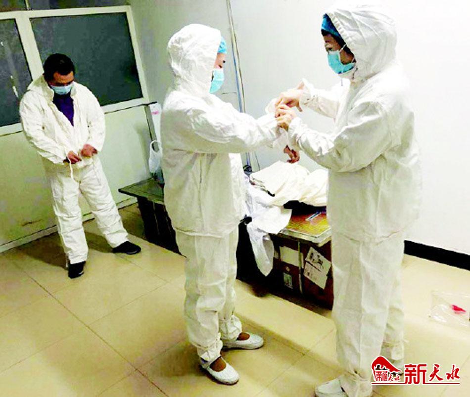 清水县人民医院院长靳建明临危受命,带领医疗救治团队第一时间收治疑似患者,在最危险的第一线密切关注患者病情,采取有效及时治疗手段诊治患者;主治医生刘彦云一次进入病房要待12个小时,由于口罩和护目镜的密闭性,12小时下来面部、眼周满是深深的压痕,防护服捂得身上一身汗,背上都长出了痱子,可是他毫无怨言;为了减少感染,放射科主任裴贵平作为一名党员,主动请缨,独自承担起消毒、拍片、审片、拍片后的消毒工作。医生不是没有儿女情长,负重前行守护健康是他们义不容辞的使命。疫情当头,护士王露毅然取消婚礼,主动申请加入到一线传染病房,20多天里,她一直和同事们并肩战斗在抗疫一线;护士长朱雅20多天在传染病区和医护人员一道悉心护理确诊患者。