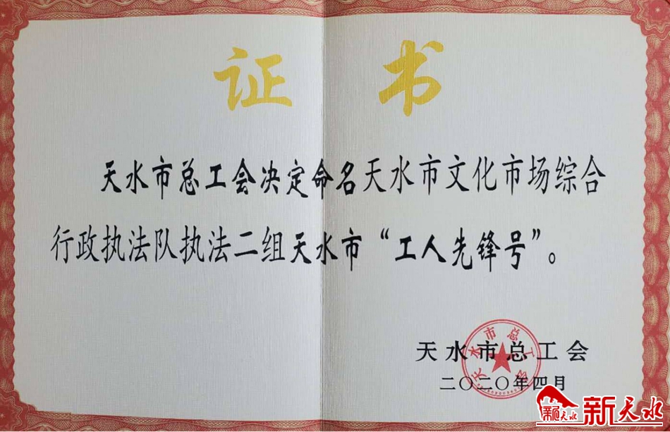 天水市文化市场综合行政执法队执法二组荣获“工人先锋号”荣誉称号