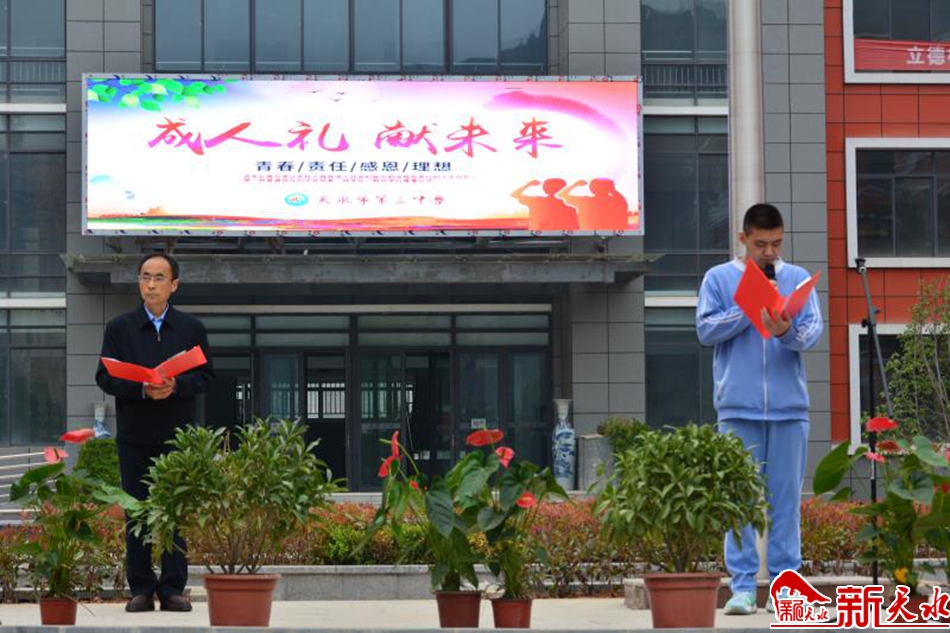 新天水讯【天水日报记者马放】十八而志 逐梦未来。5月4日上午,市第三中学在新校区举行了以“感恩成长 承担责任 励志拼搏”为主题的成人礼活动,700多名高三学生在老师、家长的祝福与见证下庄严宣誓、朱砂启智,通过庄重、朴素、温馨的仪式,引导学生们树立正确的人生目标,做理想信念坚定的爱国青年,做心怀责任、勇于担当的有志青年,做志存高远、追求卓越的有为青年,修身明礼,砥砺品行,成为国家的栋梁之才,在新时代展现当代青年的新作为。