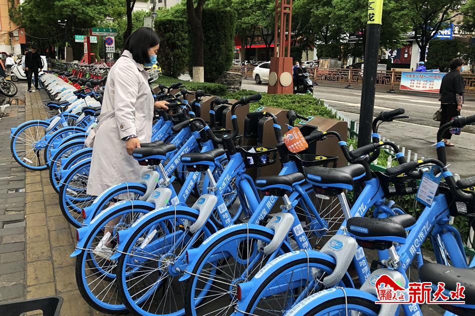 5月7日,市民扫码后准备使用共享单车。近日,一批新型共享单车在我市街头悄然亮相,给市民出行带来了“新选择”。