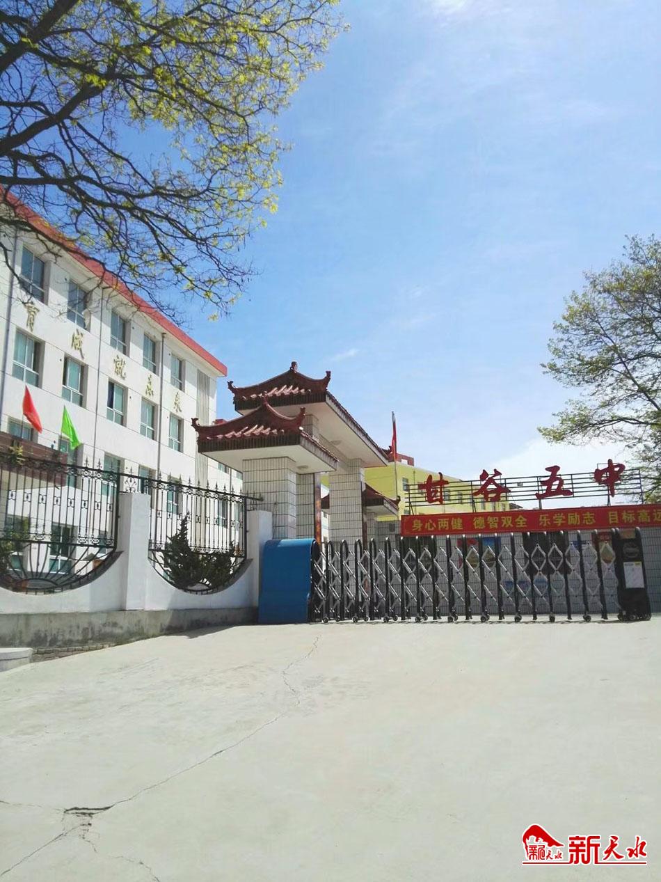 在甘谷县金山镇苍翠的秀金山下,有几座蓝白相间的楼房在山间生气勃勃,缓缓走去,不远处一棵青葱的古槐树映衬着“甘谷五中”四个红色的大字,显得格外醒目。校园依山而建,分成整齐的三阶,层析分明,错落有致。移步至校门,映入眼帘的教学楼就像一个巨人,激励着莘莘学子不忘初心,争做五中的佼佼者;校园中心区一排排清翠玉滴的冬青树,点缀着校园的每一个角落,办公室门前的樱花粉香气宜人,成为初夏的一道风景线,每每天朗气清,时有老师在旁边改作业,学生在朗诵;宿舍楼前的松柏见证着该校发展的历史,苍劲而又年轻。