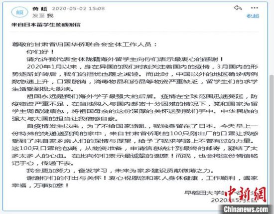 1日,日本东京工业大学和早稻田大学的甘肃籍留学生向甘肃省侨联发来感谢信。“祖国永远是我们海外学子最强大的后盾。疫情在全球范围迅速蔓延,防疫物资严重不足,在当地购入与国内邮寄十分困难的情况下,祖国为留学生调配健康包,将这份关怀送到我们手中,感动又自豪。”他们在信中写道。