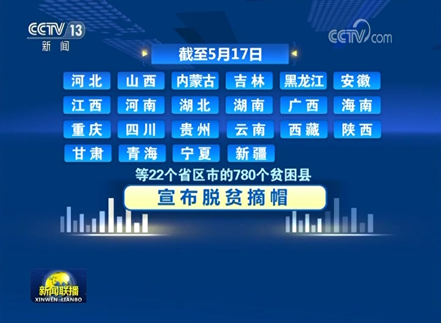 截至5月17日,河北、山西、内蒙古、吉林、黑龙江、安徽、江西、河南、湖北、湖南、广西、海南、重庆、四川、贵州、云南、西藏、陕西、甘肃、青海、宁夏、新疆等22个省区市的780个贫困县已宣布脱贫摘帽。