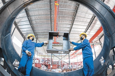 今年以来,江苏省海安市在科学防控疫情的同时,及时为企业解难纾困,帮助民营企业迅速恢复产能、拓展国内外市场,保持经济平稳运行,确保务工人员有岗上、有活干、有钱赚。图为5月17日,在海安市白甸镇一企业车间内,工人在赶制建材装备订单。