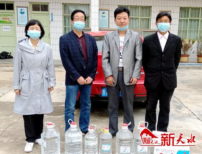 新天水讯【天水日报通讯员 毛少彬】开学以来,新阳中心学校严格按照新冠肺炎疫情防控要求,进行消毒防疫工作,为学校正常教育教学的开展创造了良好条件。近日,该校多位家长向孩子所在班级捐赠了口罩等防控物资。 5月12日上午,新阳镇天祥大药房负责人赵向奎向新阳中心学校捐赠了84消毒液、75%酒精、医用手套等价值2000多元的防控物资。