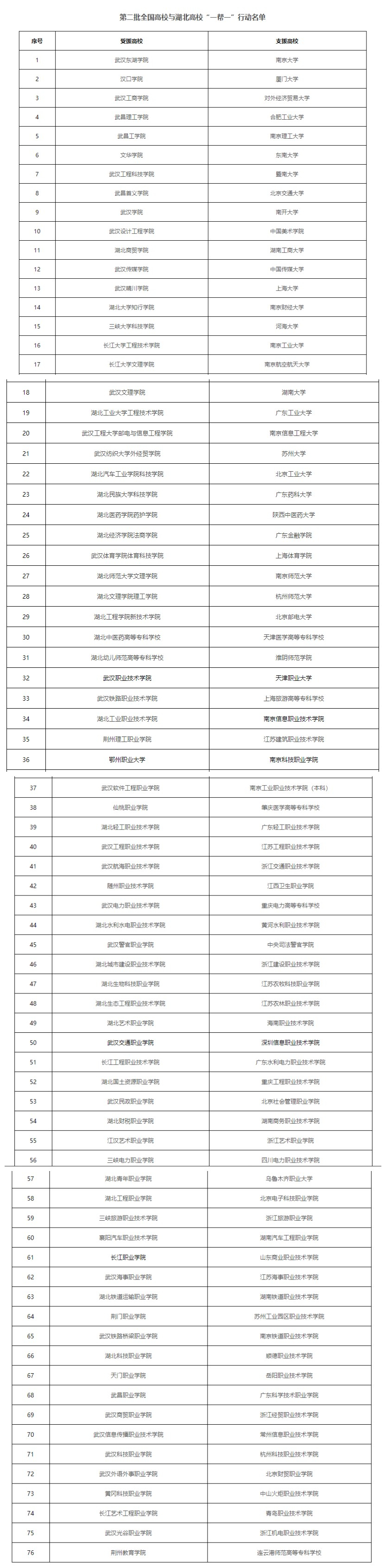据了解,第二批“一帮一”行动支援高校包括15所中央部委直属高校(含11所教育部直属高校)、15所省属普通高校、32所全国示范性高职院校和骨干高职院校,14所普通高职(含7所高水平专业群建设单位);湖北受援高校包括29所省属本科高校、5所全国示范性高职院校和骨干高职院校,41所普通高职、1所成人教育高校(办有普通专科)。