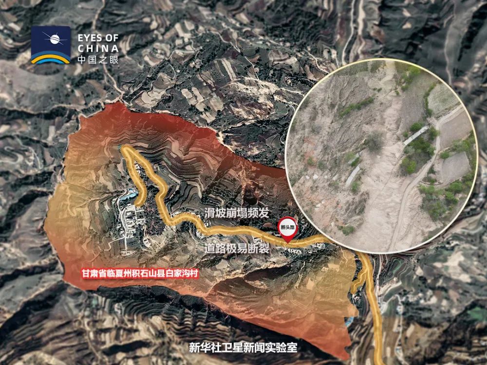 白家沟村地处湿陷性黄土滑坡带。从卫星看,整个村子山峰陡峭,基岩裸露,难以找到一块成片的平地。人只能见缝插针式地居住在疏松、干裂的黄土地上。一条崎岖的路像丝带一样“搭”在悬崖峭壁上,随时有掉下来的危险。