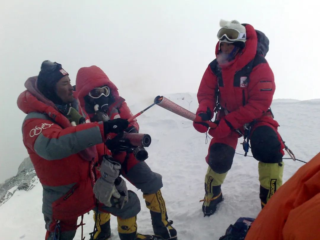这是2008年5月8日,北京奥运圣火珠峰传递登山队成功登顶珠峰,中国登山队员在峰顶展示中国国旗、奥运五环旗和北京奥运会会徽旗。新华社发