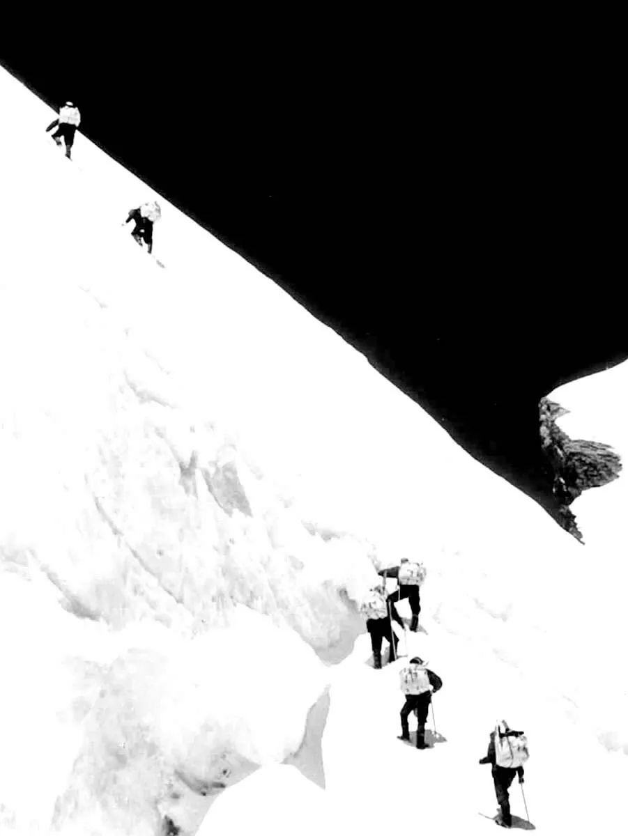 中国登山队员向珠穆朗玛峰顶峰进发。1960年5月25日北京时间4时20分,中国登山队胜利登上8848米的珠穆朗玛峰,完成了人类历史上第一次从北坡登上世界第一高峰的壮举。新华社稿 刘大义、屈银华摄
