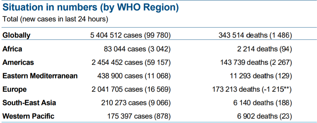 当地时间5月26日,世卫组织发布最新一期新冠肺炎每日疫情报告。截至欧洲中部夏令时间5月26日10时(北京时间5月26日16时),全球新冠肺炎新增99780例,死亡新增1486例。美洲区域确诊病例最多,达到2454452例(新增59157例),死亡143739例(新增2267例)。