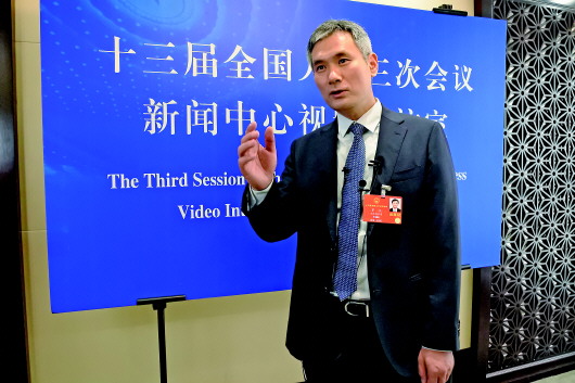 全国人大代表罗杰在十三届全国人大三次会议湖北代表团驻地的视频采访室接受采访。新华社记者熊争艳摄