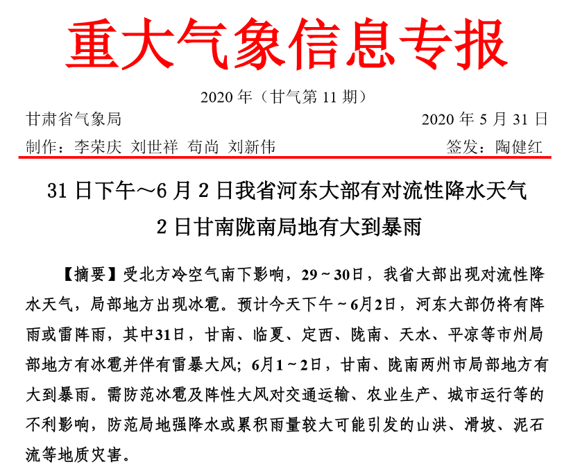 6月1日,甘南、陇南两州市阴有小到中雨,局部地方有大到暴雨;临夏、定西、天水、平凉等州市多云或阴有阵雨或雷阵雨;省内其余地方多云或晴。
