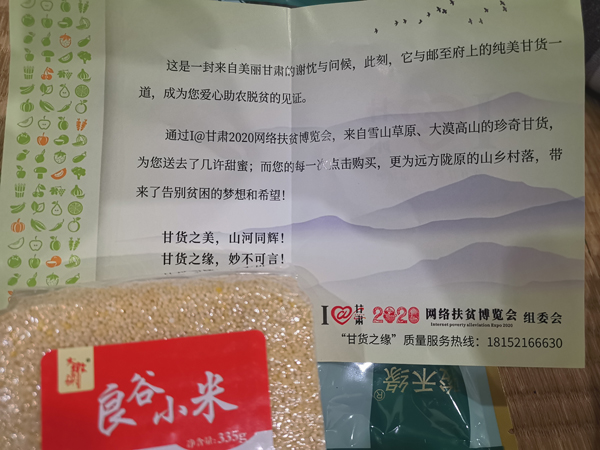 几天之后,从甘肃各地发出的快递陆续寄到刘女士手里。当她迫不及待地打开包装盒,除了新鲜的“甘货”让她满心欢喜外,放置在包装盒里的一张小小的致谢卡片,使刘女士眼前一亮、感动不已:这是一封来自美丽甘肃的谢忱与问候,此刻,它与邮至府上的纯美“甘货”一道,成为您爱心助农脱贫的见证。通过I@甘肃2020网络扶贫博览会,来自雪山草原,大漠高山的珍奇“甘货”,为您送去了几许甜蜜;而您的每一次点击购买,更为远方陇原的山乡村落,带来了告别贫困的梦想和希望!甘货之美,山河同辉!甘货之缘,妙不可言!
