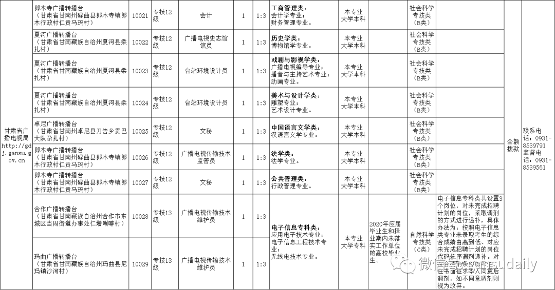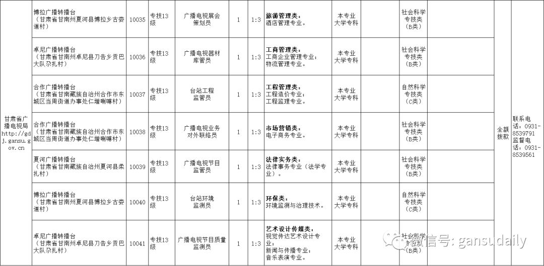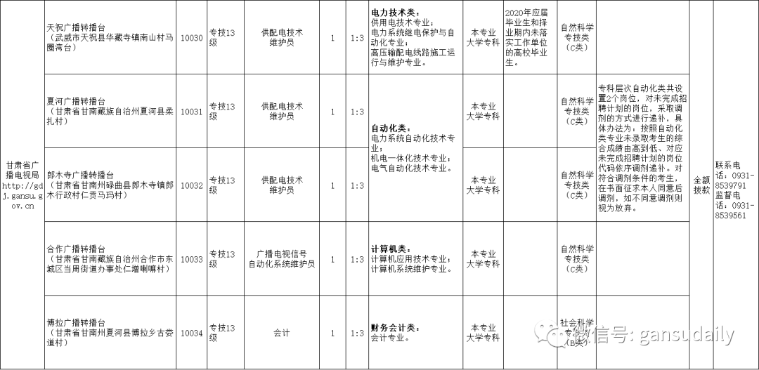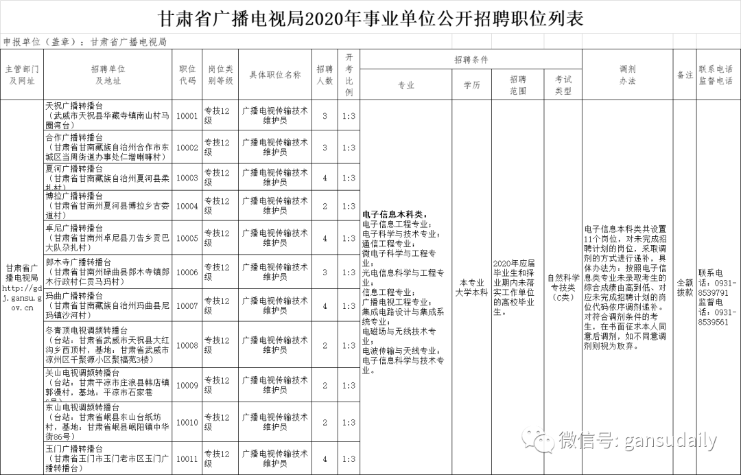 根据《事业单位公开招聘人员暂行规定》(人事部令第6号)《甘肃省事业单位公开招聘人员暂行办法》(甘办发〔2011〕22号)《中共甘肃省委组织部 甘肃省人力资源和社会保障厅关于转发〈中共中央组织部办公厅 人力资源和社会保障部办公厅关于应对新冠肺炎疫情影响做好事业单位公开招聘高校毕业生工作的通知〉的通知》(甘人社明电〔2020〕54号)要求和工作需要,现面向社会公开招聘专业技术职位工作人员70人(详见《甘肃省广播电视局2020年事业单位公开招聘职位列表》,以下简称《职位列表》。现将有关事项公告如下: