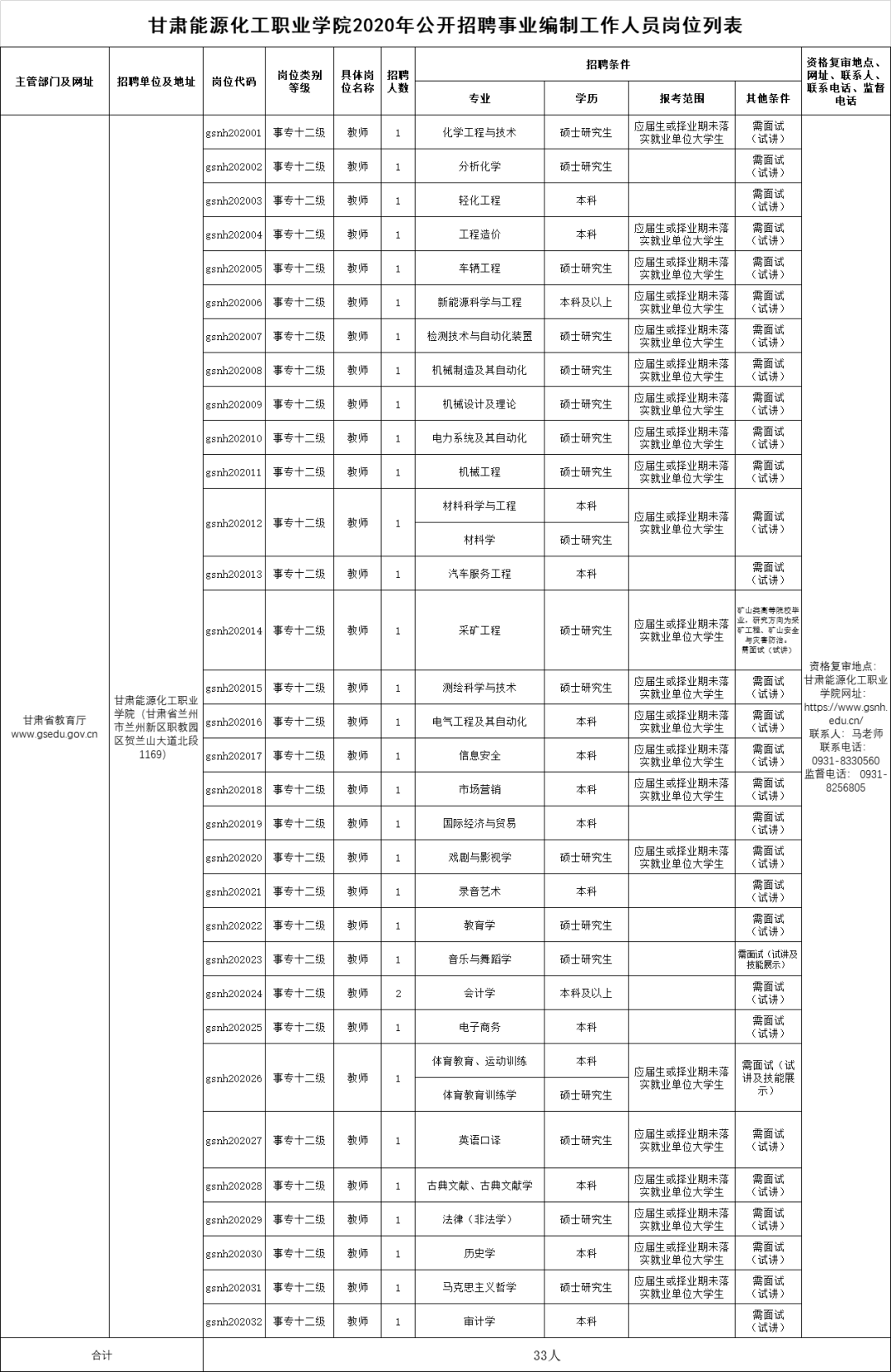 根据《事业单位公开招聘人员暂行规定》(人事部第6号令)、《甘肃省事业单位公开招聘人员暂行办法》(甘办发﹝2011﹞22号)规定。甘肃能源化工职业学院院2020年面向社会公开招聘专业技术人员33人(事业编制),具体岗位列表详见附件。现将有关事项公告如下: