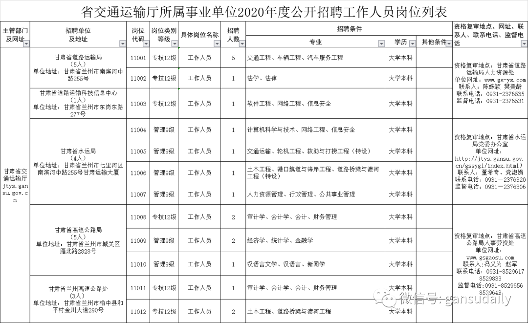 根据《事业单位公开招聘人员暂行规定》(人事部令第6号)、《甘肃省事业单位公开招聘人员暂行办法》(甘办发〔2011〕22号)有关规定和省委组织部、省人社厅《关于转发<中组部办公厅、人社部办公厅关于应对新冠肺炎疫情影响做好事业单位公开招聘高校毕业生工作的通知>的通知》(甘人社明电〔2020〕54号)精神,经省人力资源和社会保障厅同意,省交通运输厅所属21个事业单位2020年公开招聘工作人员731名,其中,专业技术岗位389名,管理岗位284名,工勤技能岗位58名(具体招聘岗位详见《甘肃省交通运输厅所属事业单位2020年度公开招聘工作人员岗位列表》,以下简称《岗位列表》)。现将有关事项公告如下: