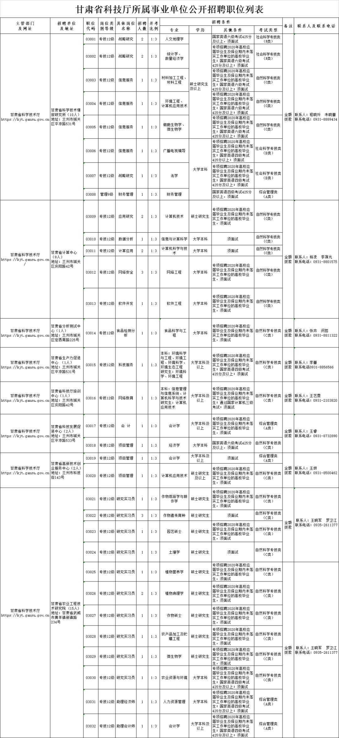 根据《甘肃省事业单位公开招聘人员暂行办法》(甘办发〔2011〕22号)、《中共甘肃省委组织部 甘肃省人力资源和社会保障厅关于转发<中共中央组织部办公厅 人力资源社会保障部办公厅关于应对新冠肺炎疫情影响做好事业单位公开招聘高校毕业生工作的通知>》(甘人社明电〔2020〕54号),甘肃省科技厅结合工作需要,2020年共有8家事业单位计划面向高校毕业生(含择业期内未落实工作单位的高校毕业生)和社会公开招聘工作人员41人。现将有关事项公告如下:
