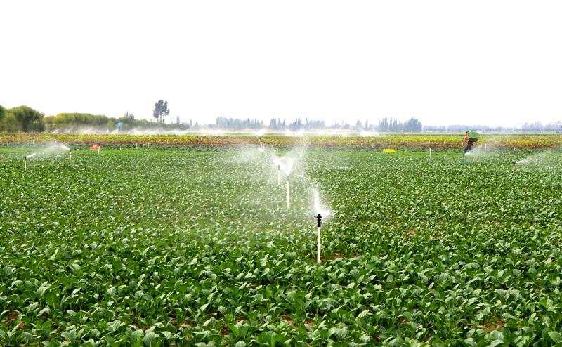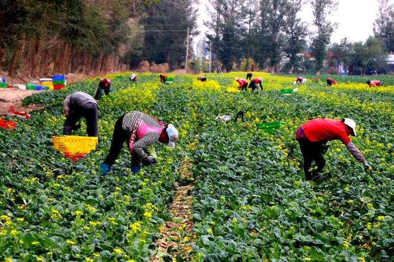 临近傍晚,甘肃省民勤县苏武镇羊路村气温舒适,夕阳的光辉透过薄云洒在翠绿的菜叶上,滴灌喷头正在旋转中喷洒着水分。苏武现代农业产业园供港喷灌蔬菜基地的田埂里,十余名工人将成熟的菜叶采摘分类至包装箱内,呈现出一派繁忙的劳作景象。