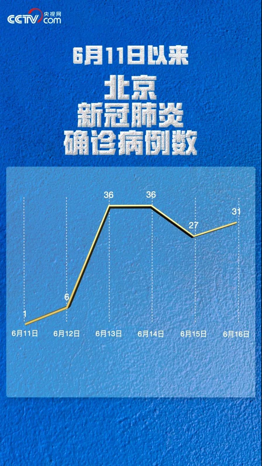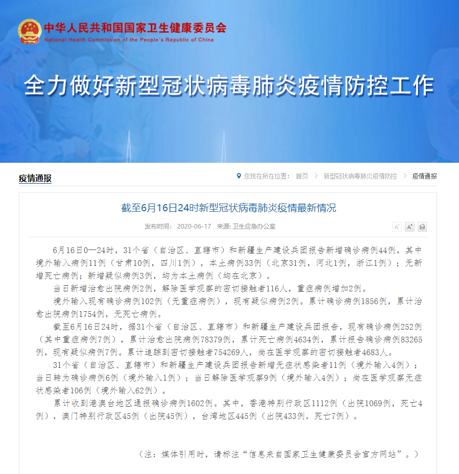 6月16日0—24时,31个省(自治区、直辖市)和新疆生产建设兵团报告新增确诊病例44例,其中境外输入病例11例(甘肃10例,四川1例),本土病例33例(北京31例,河北1例,浙江1例);无新增死亡病例;新增疑似病例3例,均为本土病例(均在北京)。
