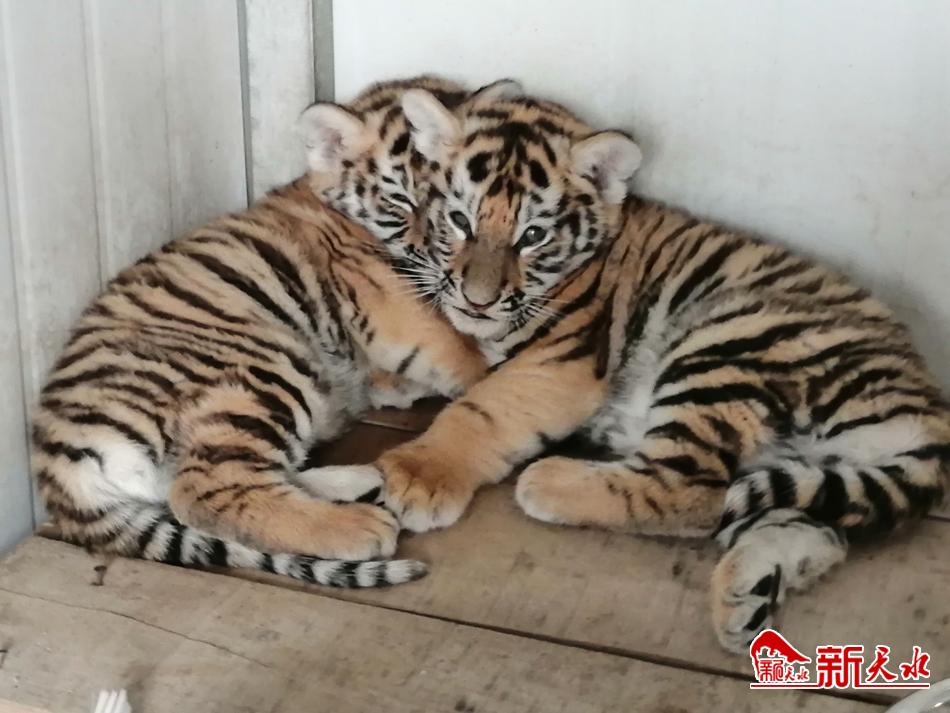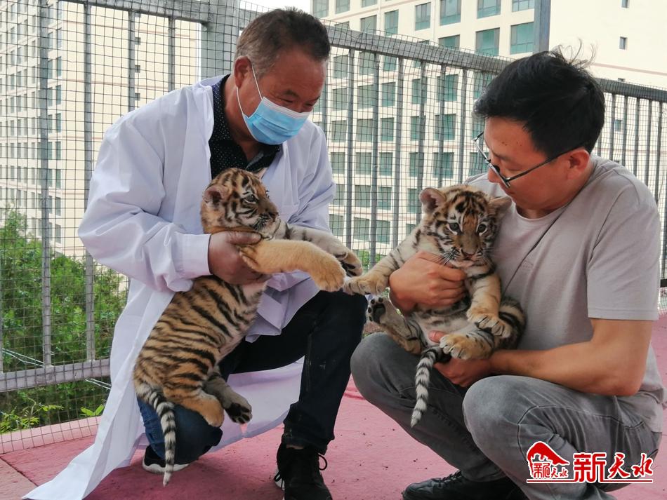 新天水讯【天水晚报记者蔚军平】6月17日,在天水市动物园,由一只东北虎产下的两只雌性虎宝宝正在与动物园的工作人员嬉戏,出生50多天的两只东北虎幼崽目前已经和虎妈妈分开“居住”,精神状态良好,两只虎宝宝的出生,标志着我市乃至甘肃省人工繁殖东北虎首次取得成功。据市动物园工作人员介绍,该园东北虎笼舍中饲养了一雄二雌共三只东北虎,其中一只8岁的雌性东北虎经过105天的孕期,于4月24日10时至12点,顺利产下两只东北虎幼崽,经辨别均为雌性幼崽,两只幼崽出生时,目测体重均为一斤左右。母虎产下两只虎宝宝后,工作人员通过监控设备,对母虎与幼崽进行24小时观察,确保幼崽吃到“初乳”,了解它们的精神状况。