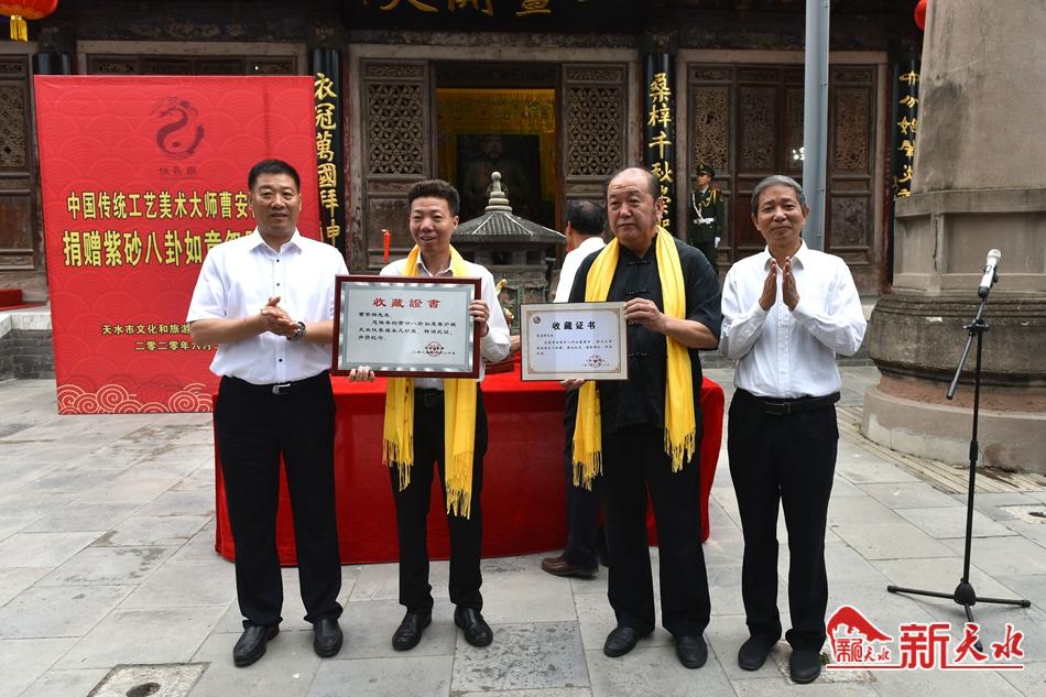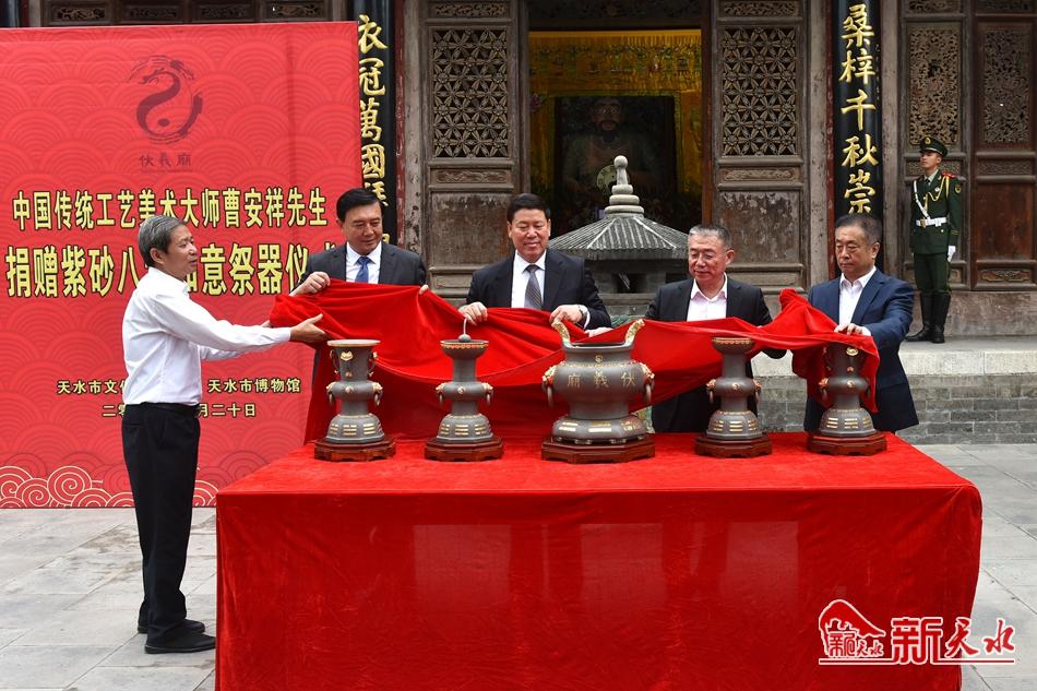 新天水讯【天水日报记者郝勤学 周文涛】6月20日,中国传统工艺美术大师曹安祥向伏羲庙捐赠了“紫砂八卦如意祭器”,捐赠仪式在伏羲庙举行。