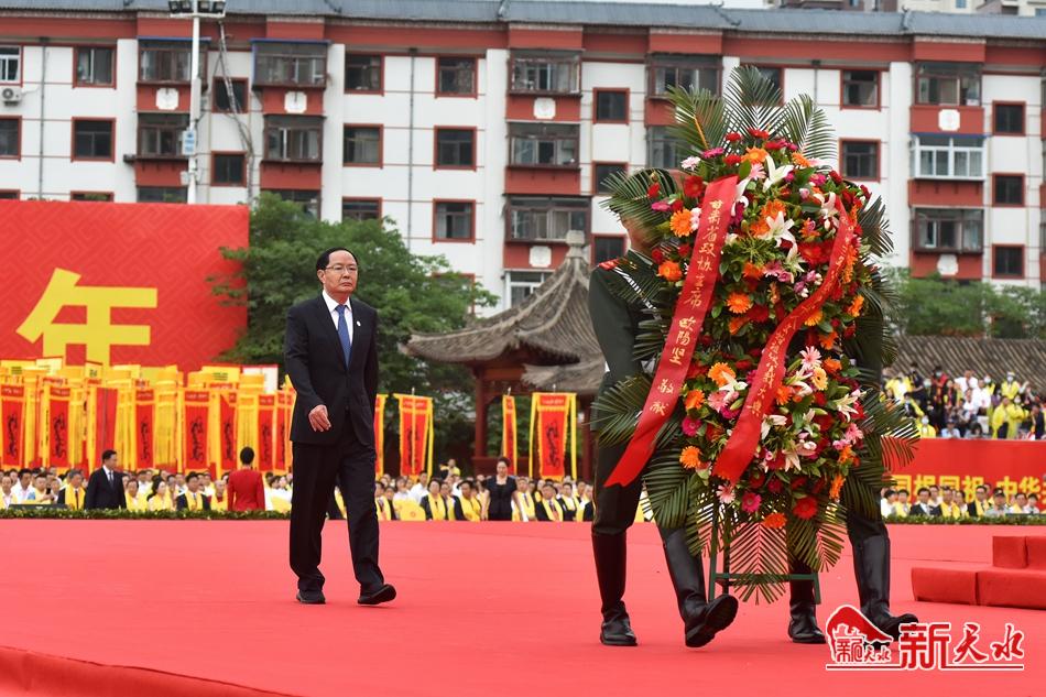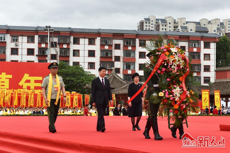 ▲甘肃省人大常委会党组书记、副主任王玺玉,甘肃省人民政府副省长、省公祭伏羲大典活动领导小组副组长何伟、武警甘肃总队参谋长黄洁敬献花篮