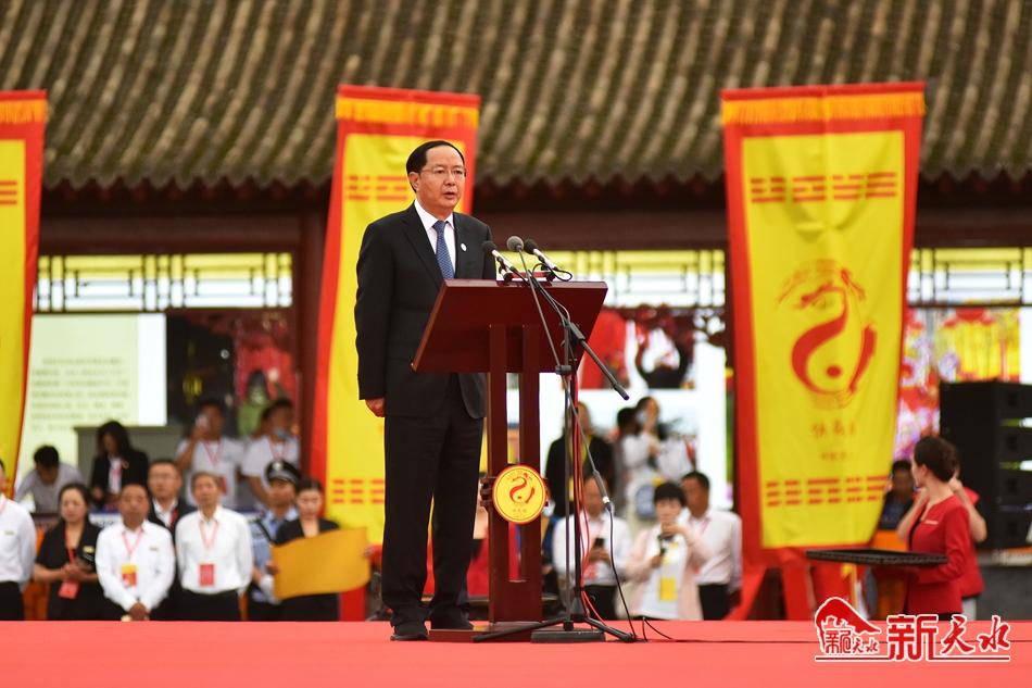击鼓鸣钟之后,唐仁健心怀虔诚崇敬之情,面朝伏羲圣像方向恭读祭文,颂扬伏羲功德,表达羲皇儿女继往开来之志,祈愿伟大祖国平安昌盛。恭读祭文毕,现场全体人员鞠躬敬祭,随后依次进入伏羲庙内,向伏羲圣像敬献花篮,拜谒伏羲圣像,感怀伏羲圣德。