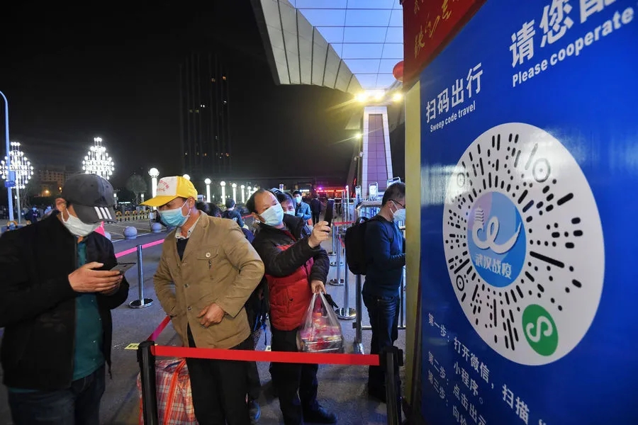 2020年4月7日晚,武昌站西广场,旅客排队扫健康码进站。