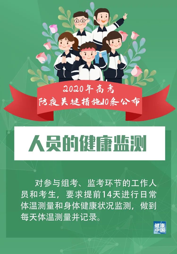 一是人员的健康监测。对参与组考、监考环节的工作人员和考生,要求提前14天进行日常体温测量和身体健康状况监测,做到每天体温测量并记录。