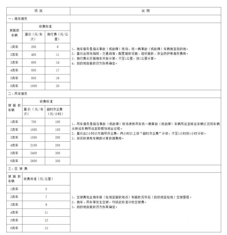 注:1.拖车、吊车救援服务收费按被救援车辆车型计费。车型分类按《收费公路车辆通行费车型分类》行业标准(JT/T489-2019)执行。