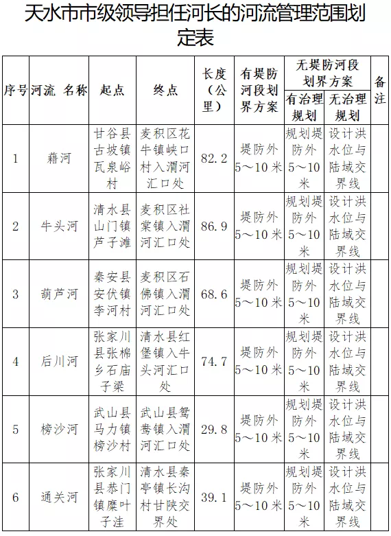 附件:天水市市级领导担任河长的河流管理范围划定表(