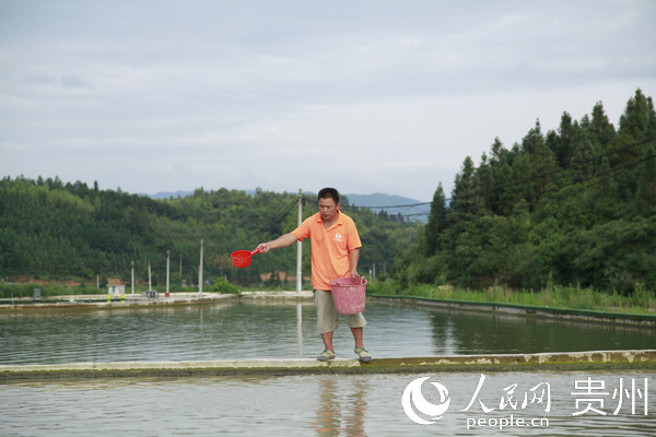 欧阳昌成正在给鱼苗喂食。李宇 摄