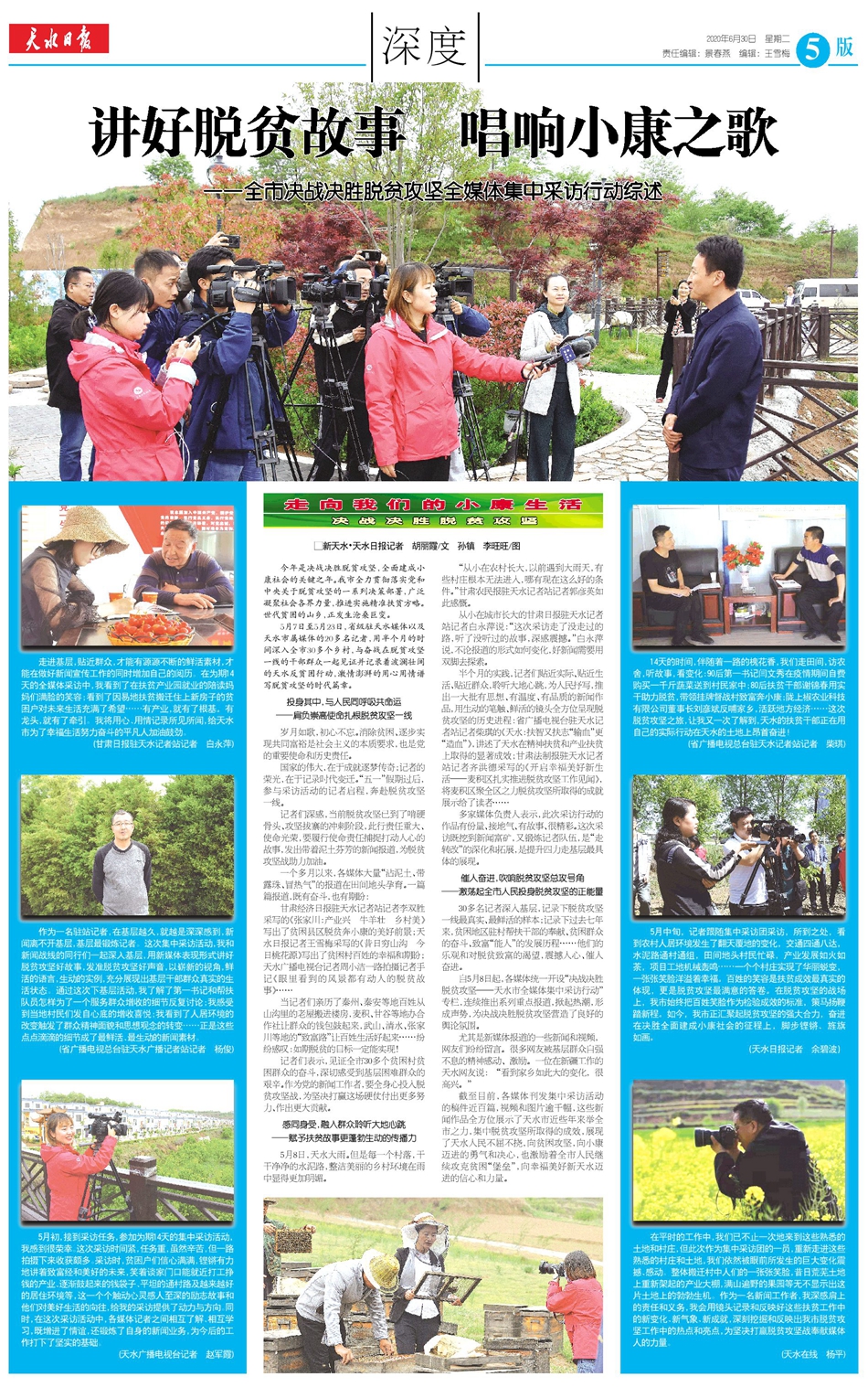 甘肃经济日报驻天水记者站记者李双胜采写的《张家川:产业兴 牛羊壮 乡村美》写出了贫困县区脱贫奔小康的美好前景;天水日报记者王雪梅采写的《昔日穷山沟 今日桃花源》写出了贫困村百姓的幸福和期盼;天水广播电视台记者周小洁一路拍摄记者手记《眼里看到的风景都有动人的脱贫故事》……