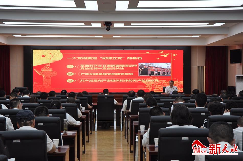 新天水讯“自中国共产党诞生之日起,党就把严明纪律、从严治党写在自己的旗帜上,并把严明党的组织纪律作为从严治党的重要规则写入自己的行动纲领——《党章》之中。每一部党章都有鲜明的时代烙印,‘活’在党章中的纪律体现了当时党最迫切的纪律需求。一部党章发展史就是一部党的纪律建设史,也是一部从严管党治党史。”在中国共产党诞辰99周年之际,天水市委常委、市纪委书记、市监委主任郝觉民以《党章中的纪律》为题,从党的一大党纲奠定“纪律立党”的基石到党的十九大党章把纪律摆在更加突出位置,详尽系统的阐述了纪律规定在党的章程中的重要性,纪律建设在党的建设中的重要地位,为市纪委监委机关全体党员上了一堂生动详实、深入浅出的专题党课。