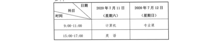 第二次考试全省统一考试时间为7月11日至12日,考试科目分为公共课和专业课,公共课为计算机(分理工农医类、文史财经类)、英语,每科满分为150分;专业课满分为200分,每门课考试时间为120分钟。