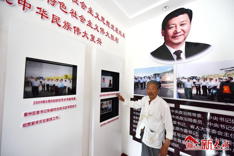 2009年6月,时任中共中央政治局常委、中央书记处书记、国家副主席的习近平来到秦州区皂郊镇贾家寺村,看望慰问因地震的受灾群众,指导灾后重建工作。那时,村口还只有一条土路,灾后重建的房屋也尚未完全修建好。习总书记走进村里,访农户、问民生,关注着乡亲们生产生活的点点滴滴,并殷殷叮嘱大家:要以人为本、因地制宜、量力而行,高质量完成恢复重建任务。