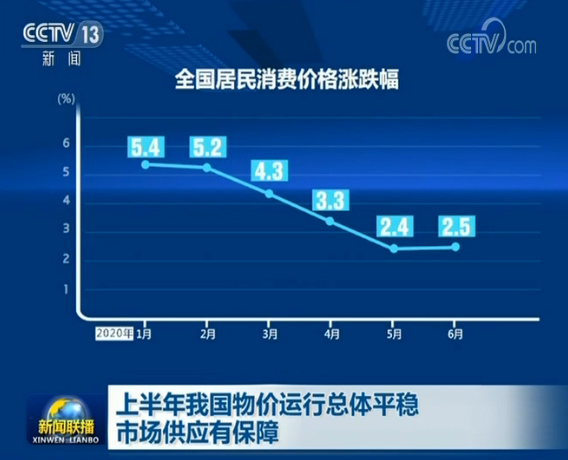 央视网消息(新闻联播):国家统计局今天(7月9日)公布的数据显示,上半年我国物价运行总体平稳,在面临新冠疫情较强冲击下,重要民生商品供应充足,主要农副食品的生产和流通秩序良好,市场需求进一步回升。