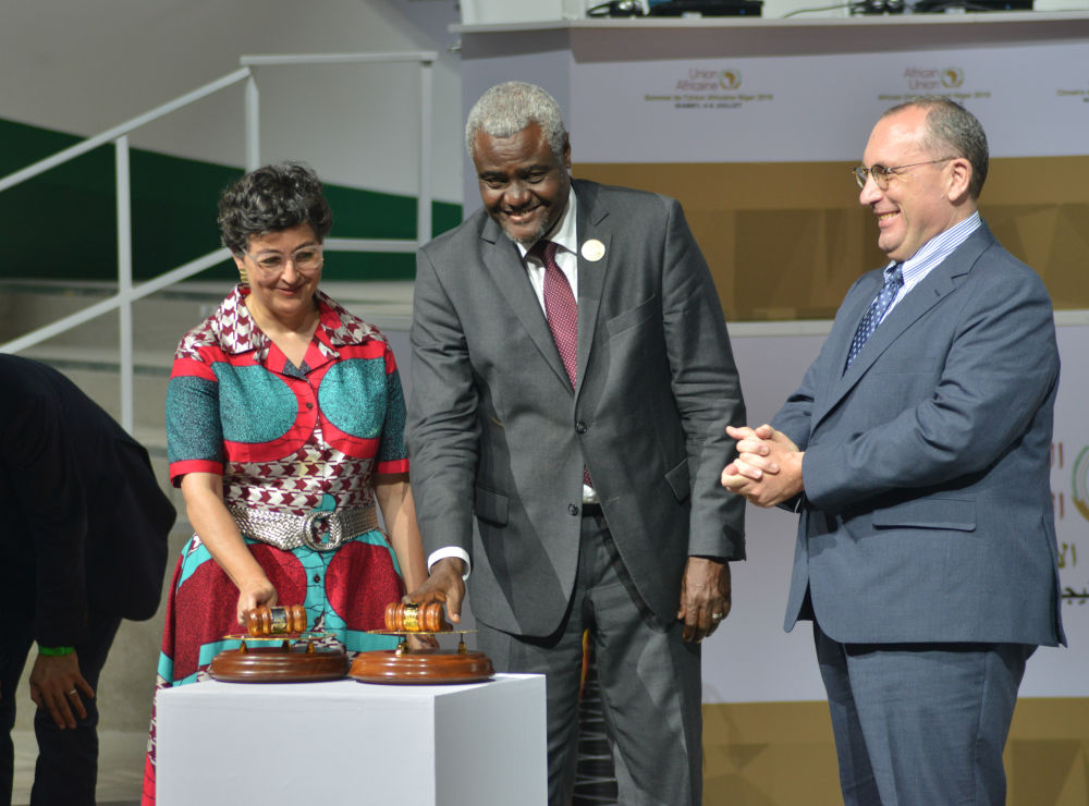 2019年7月7日,在尼日尔首都尼亚美,非盟委员会主席法基(中)宣布非洲大陆自贸区正式运行。(新华社发)