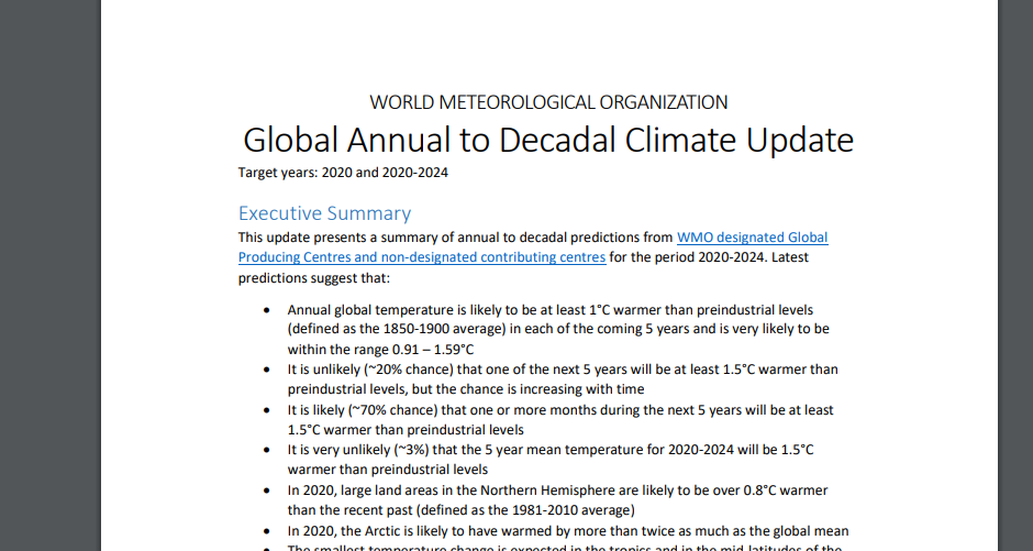 世界气象组织的报告预测,未来五年(2020—2024年),每年的全球年均气温都有可能比工业化前(1850—1900年)至少高出1°C,且至少有一年高出1.5°C的可能性为20%。
