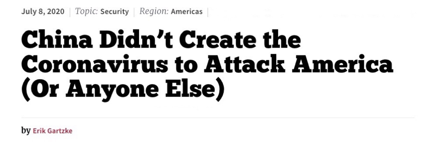 当地时间8日,美国加州大学圣地亚哥分校政治学教授埃里克·加兹克( Erik Gartzke)在美国《国家利益》网站发表文章称,中国没有制造新冠病毒去攻击美国或其他国家。