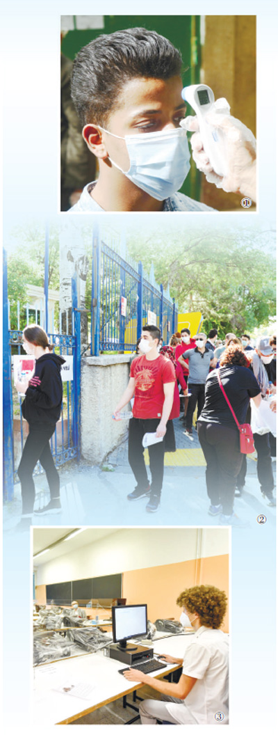 图①:6月21日,埃及开罗的一处考场外,考生正在接受体温检测。 图②:6月27日,学生们进入土耳其安卡拉的一处考场。